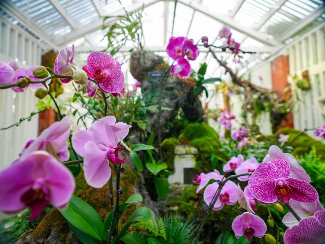 与人民公园的开放热闹形成巧妙对话的,是兰圃的静谧深邃。在这座始建于上世纪60年代的专类园里,蝴蝶兰、跳舞兰等数十种兰花不仅仅以传统盆栽形式展出,更是与蕨类、苔藓等伴生植物一起,立体再现热带雨林中的生长环境。